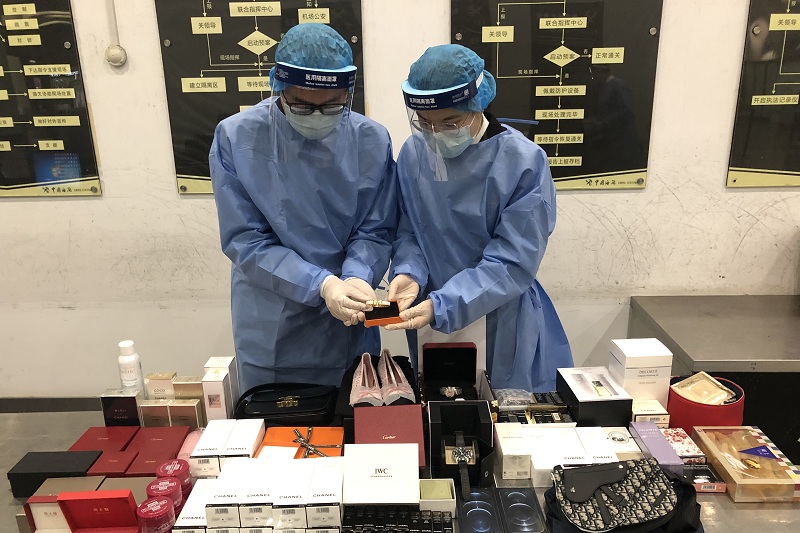 當(dāng)日,現(xiàn)場(chǎng)關(guān)員對(duì)入境旅客行李物品進(jìn)行查驗(yàn)時(shí)發(fā)現(xiàn),2名旅客的行李機(jī)檢圖像異常。開(kāi)箱后發(fā)現(xiàn)行李箱中滿滿當(dāng)當(dāng)裝著各種名牌奢侈品和化妝品。其中蛋卷盒和餅干盒里藏著“卡地亞”“萬(wàn)國(guó)”手表,此外行李箱里還裝著“迪奧”“賽琳”背包,“香奈兒”女鞋,“蘋果”手機(jī),“迪奧”“蘭蔻”“黛珂”護(hù)膚品等奢侈品和化妝品。經(jīng)清點(diǎn),累計(jì)有90件。